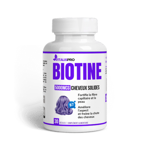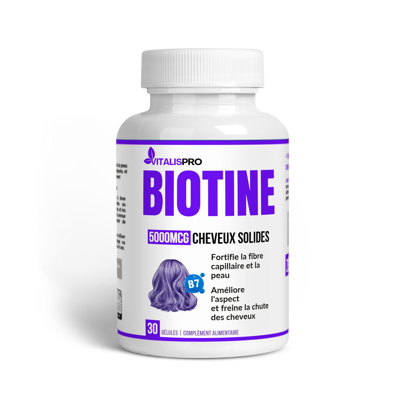 - Biotine Naturelle (Vitamine B7) : 500mg par gélule. Un apport essentiel reconnu pour ses bienfaits sur la peau, les cheveux et les ongles.